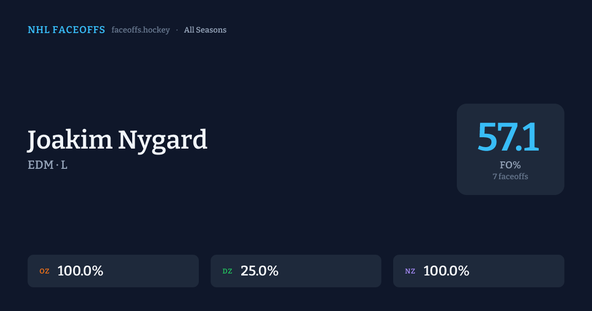 Joakim Nygard has a 2019-20 faceoff win percentage of 50.0% across 6 faceoffs in the 2019-20 season. Best zone: Offensive (100.0%).
