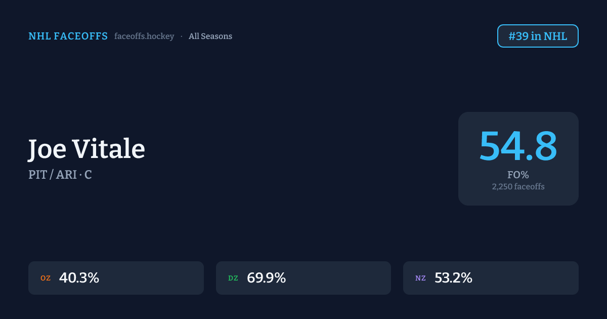 Joe Vitale has a career faceoff win percentage of 54.8% across 2,250 faceoffs. Best zone: Defensive (69.9%). Ranked #39 in the league.