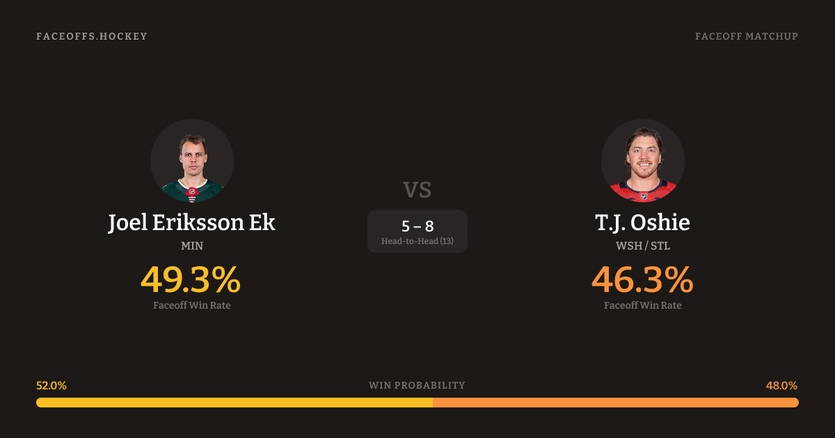 Joel Eriksson Ek holds a +3.3% FO% edge overall. Look for Oshie on offensive-zone draws (100% H2H, 6 meetings).