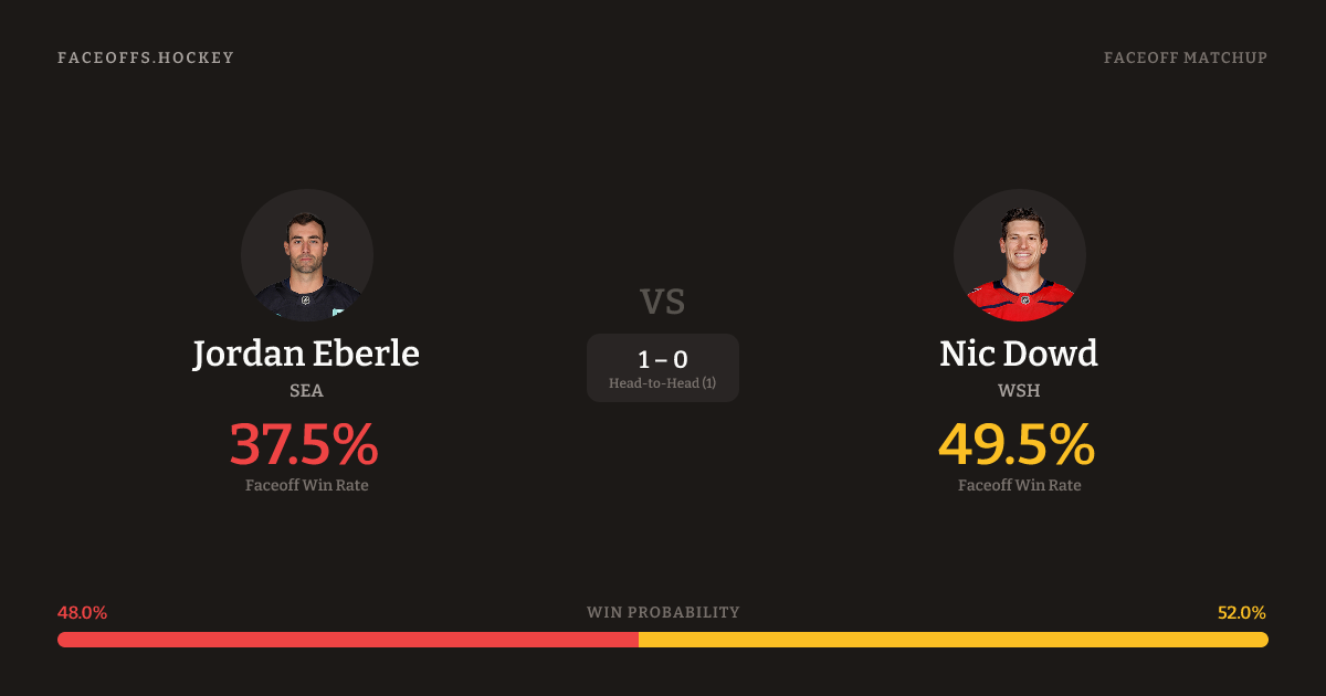 Nic Dowd holds a +5.6% FO% edge overall. Look for Eberle on offensive-zone draws (100% H2H, 3 meetings). Eberle wins 38.5% vs right-shot opponents — Dowd shoots right.