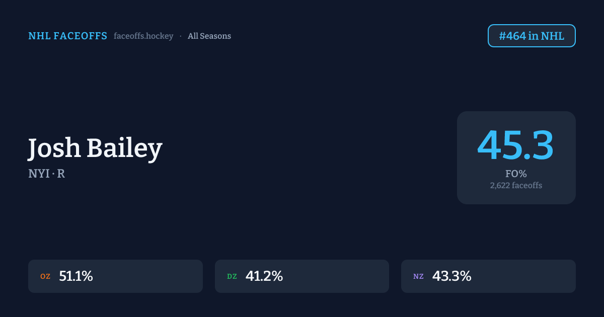 Josh Bailey has a career faceoff win percentage of 45.3% across 2,622 faceoffs. Best zone: Offensive (51.1%). Ranked #464 in the league.