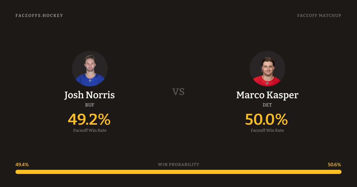 Josh Norris holds a +8.9% FO% edge overall. Norris wins 54.4% vs left-shot opponents — Kasper shoots left.