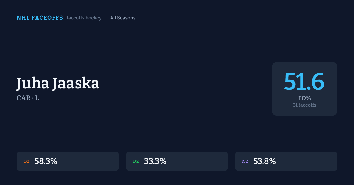 Juha Jaaska has a career faceoff win percentage of 51.6% across 31 faceoffs. Best zone: Offensive (58.3%).