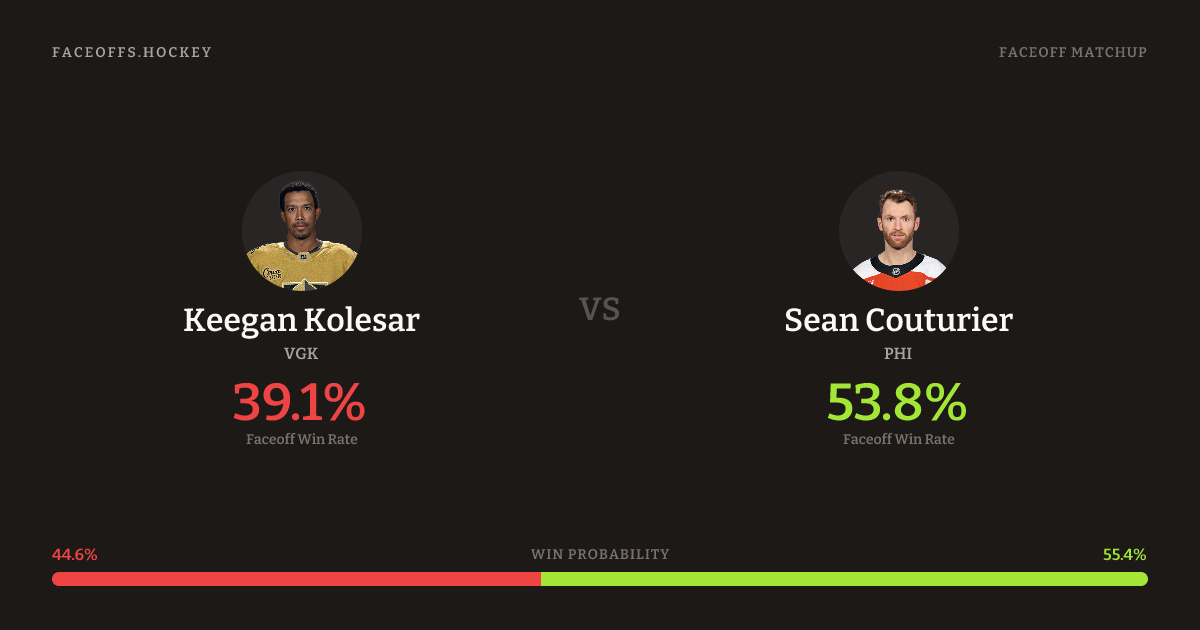 Sean Couturier holds a +15.2% FO% edge overall. Kolesar wins 38.9% vs left-shot opponents — Couturier shoots left.