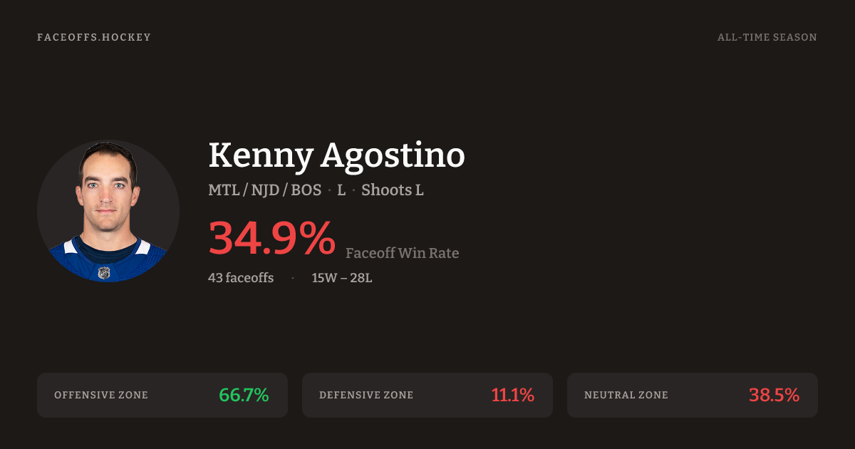 Kenny Agostino has a 2018-19 faceoff win percentage of 35.7% across 42 faceoffs in the 2018-19 season. Best zone: Offensive (66.7%).