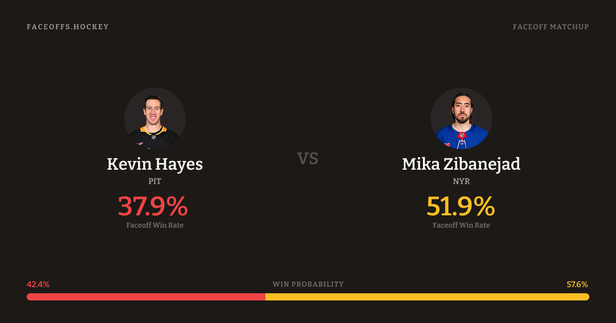 Kevin Hayes holds a +2.7% FO% edge overall. Look for Hayes on offensive-zone draws (82% H2H, 11 meetings).