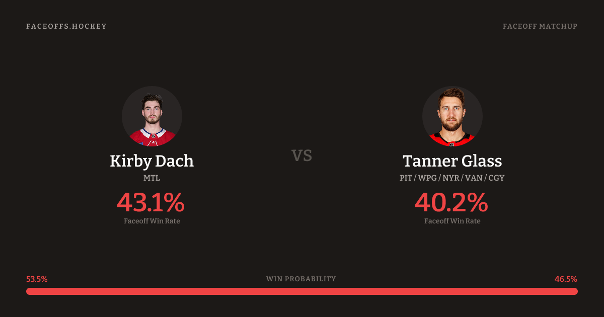 Tanner Glass holds a +3.6% FO% edge overall. Dach wins 35.1% vs left-shot opponents — Glass shoots left.