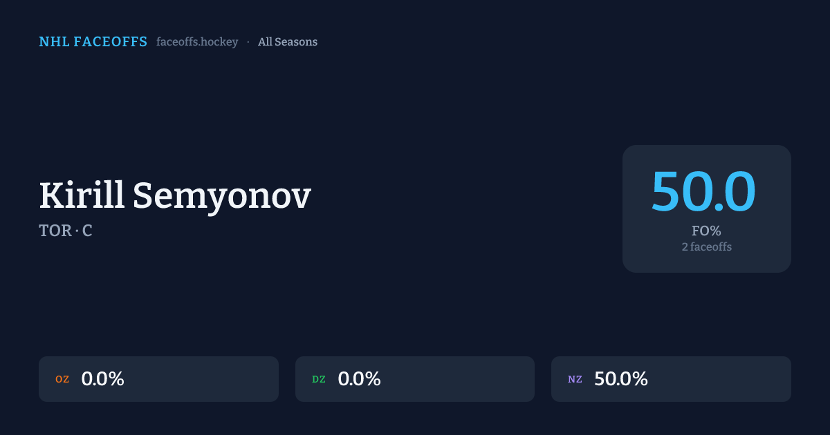 Kirill Semyonov has a career faceoff win percentage of 50.0% across 2 faceoffs. Best zone: Neutral (50.0%).