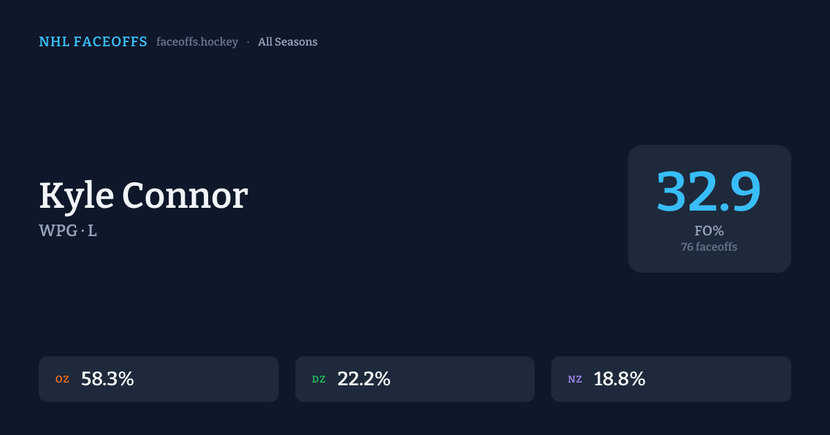 Kyle Connor has a career faceoff win percentage of 32.9% across 76 faceoffs. Best zone: Offensive (58.3%).