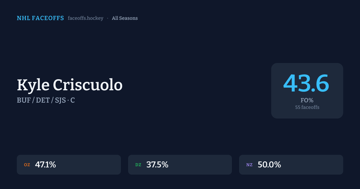 Kyle Criscuolo has a career faceoff win percentage of 43.6% across 55 faceoffs. Best zone: Neutral (50.0%).