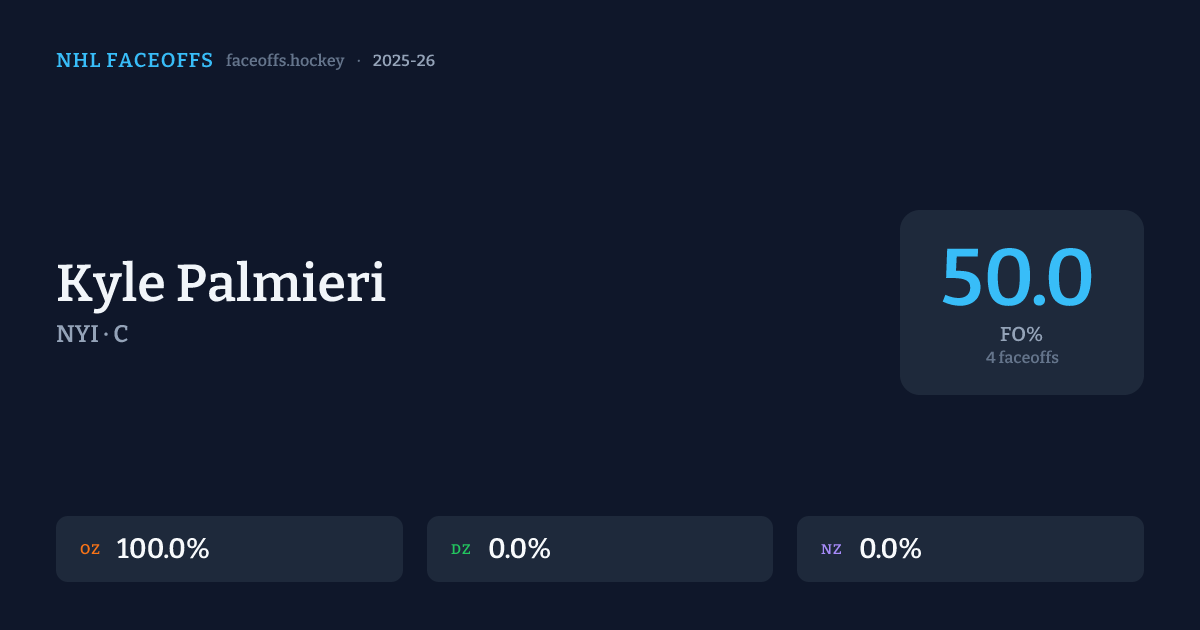 Kyle Palmieri has a career faceoff win percentage of 34.8% across 486 faceoffs. Best zone: Offensive (60.9%). Ranked #722 in the league.