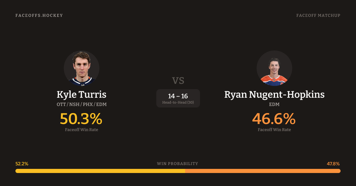 Kyle Turris holds a +8.3% FO% edge overall. Look for Turris on defensive-zone draws (100% H2H, 3 meetings).