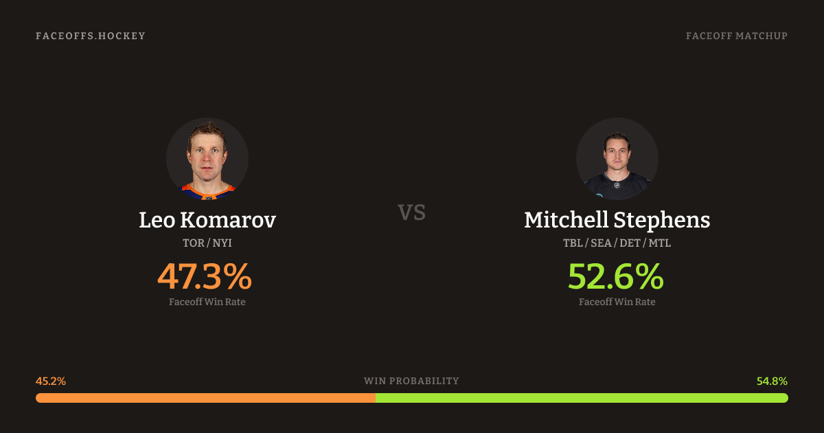 Komarov shoots left. Stephens is 52.3% vs left-shot opponents (709).