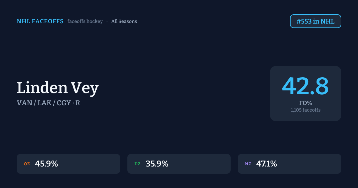 Linden Vey has a career faceoff win percentage of 42.8% across 1,105 faceoffs. Best zone: Neutral (47.1%). Ranked #553 in the league.