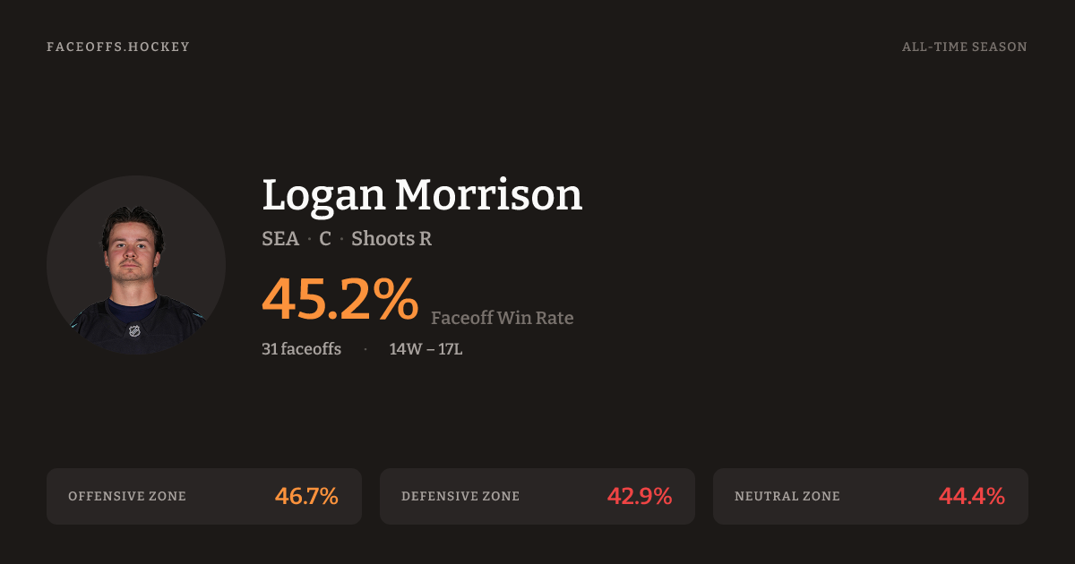 Logan Morrison has a 2023-24 faceoff win percentage of 45.2% across 31 faceoffs in the 2023-24 season. Best zone: Offensive (46.7%).