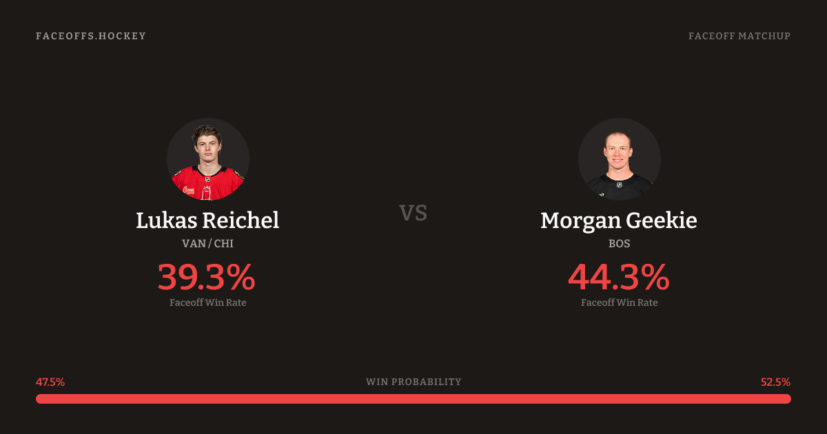 These two are closely matched in overall FO% (43.4% vs 44.1%). Look for Reichel on defensive-zone draws (100% H2H, 4 meetings). Reichel wins 43.0% vs right-shot opponents — Geekie shoots right.
