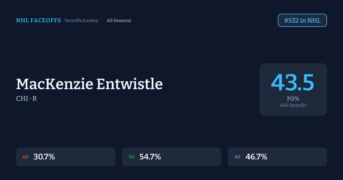 MacKenzie Entwistle has a career faceoff win percentage of 43.5% across 665 faceoffs. Best zone: Defensive (54.7%). Ranked #532 in the league.