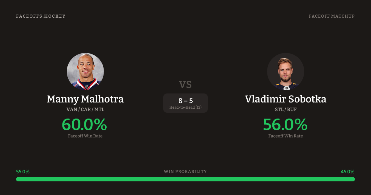 Manny Malhotra holds a +10.1% FO% edge overall. Look for Malhotra on defensive-zone draws (100% H2H, 3 meetings). Malhotra wins 61.2% vs left-shot opponents — Sobotka shoots left.