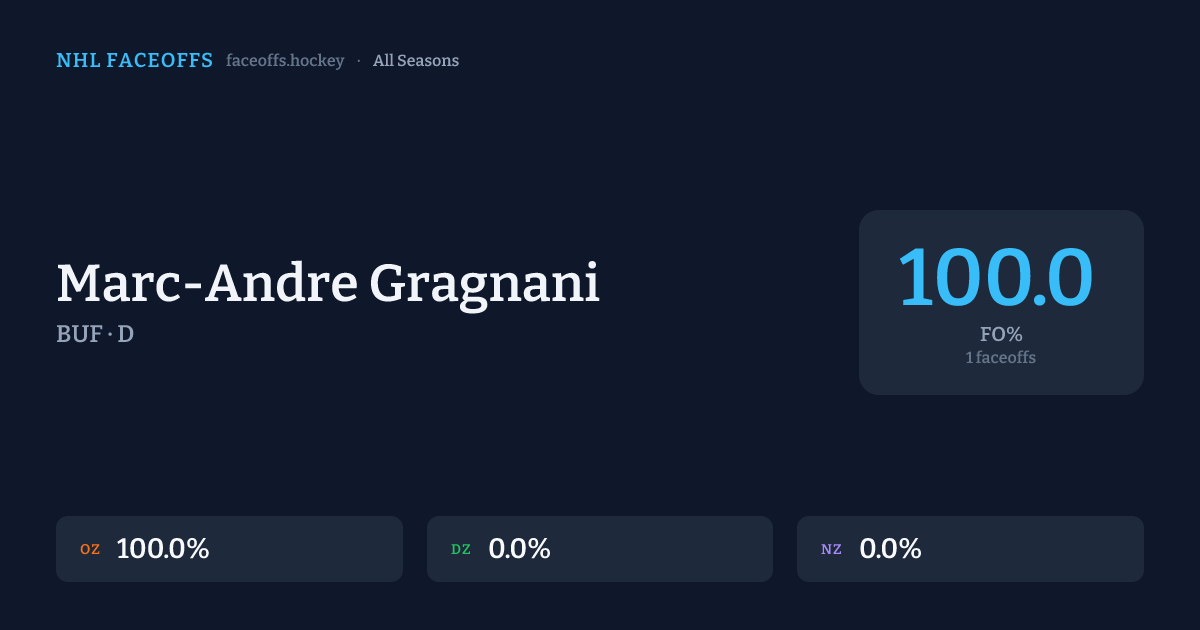 Marc-Andre Gragnani has a career faceoff win percentage of 100.0% across 1 faceoffs. Best zone: Offensive (100.0%).