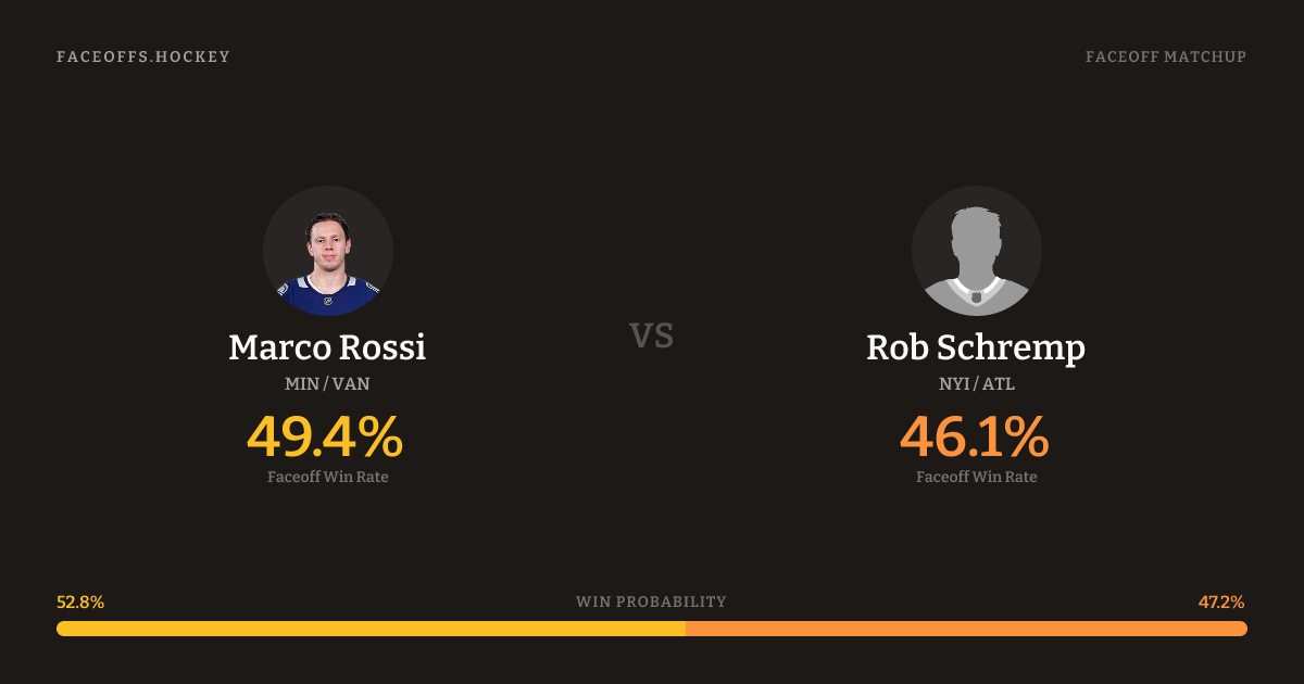 Rossi shoots left. Schremp is 48.2% vs left-shot opponents (299).