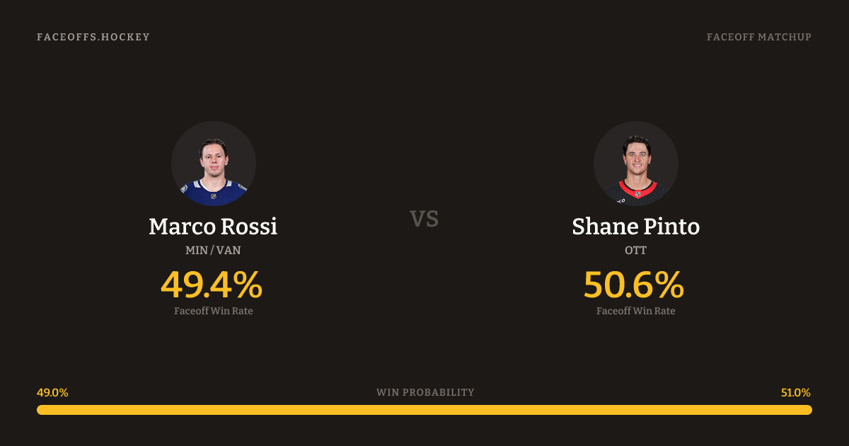 Shane Pinto holds a +3.3% FO% edge overall. Look for Rossi on offensive-zone draws (80% H2H, 5 meetings). Rossi wins 46.7% vs right-shot opponents — Pinto shoots right.