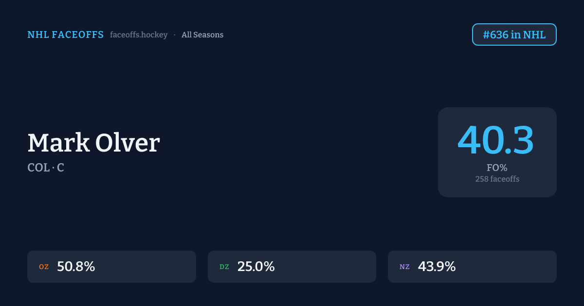 Mark Olver has a career faceoff win percentage of 40.3% across 258 faceoffs. Best zone: Offensive (50.8%). Ranked #636 in the league.