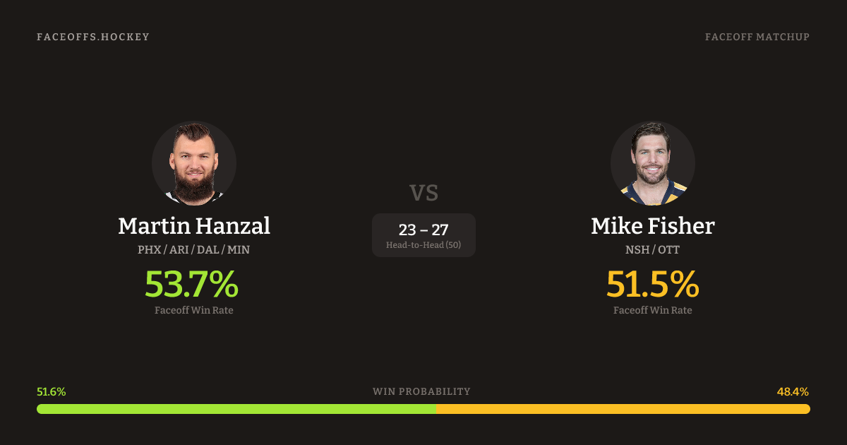 Martin Hanzal holds a +2.6% FO% edge overall. Look for Fisher on offensive-zone draws (75% H2H, 4 meetings). Hanzal wins 53.7% vs right-shot opponents — Fisher shoots right.