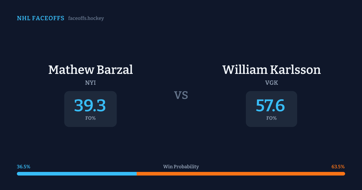 William Karlsson holds a +5.4% FO% edge overall. Look for Barzal on offensive-zone draws (100% H2H, 3 meetings). Barzal wins 43.1% vs left-shot opponents — Karlsson shoots left.