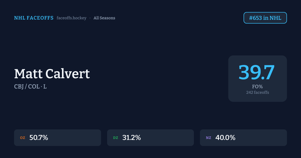 Matt Calvert has a career faceoff win percentage of 39.7% across 242 faceoffs. Best zone: Offensive (50.7%). Ranked #653 in the league.