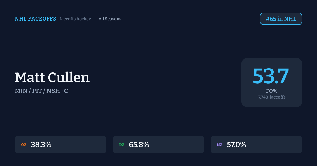 Matt Cullen has a career faceoff win percentage of 53.7% across 7,743 faceoffs. Best zone: Defensive (65.8%). Ranked #65 in the league.