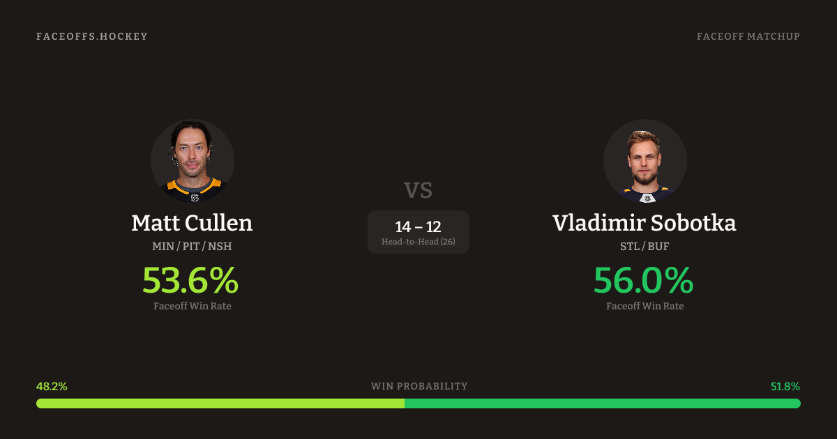 Vladimir Sobotka holds a +2.4% FO% edge overall. Look for Cullen on defensive-zone draws (70% H2H, 10 meetings).