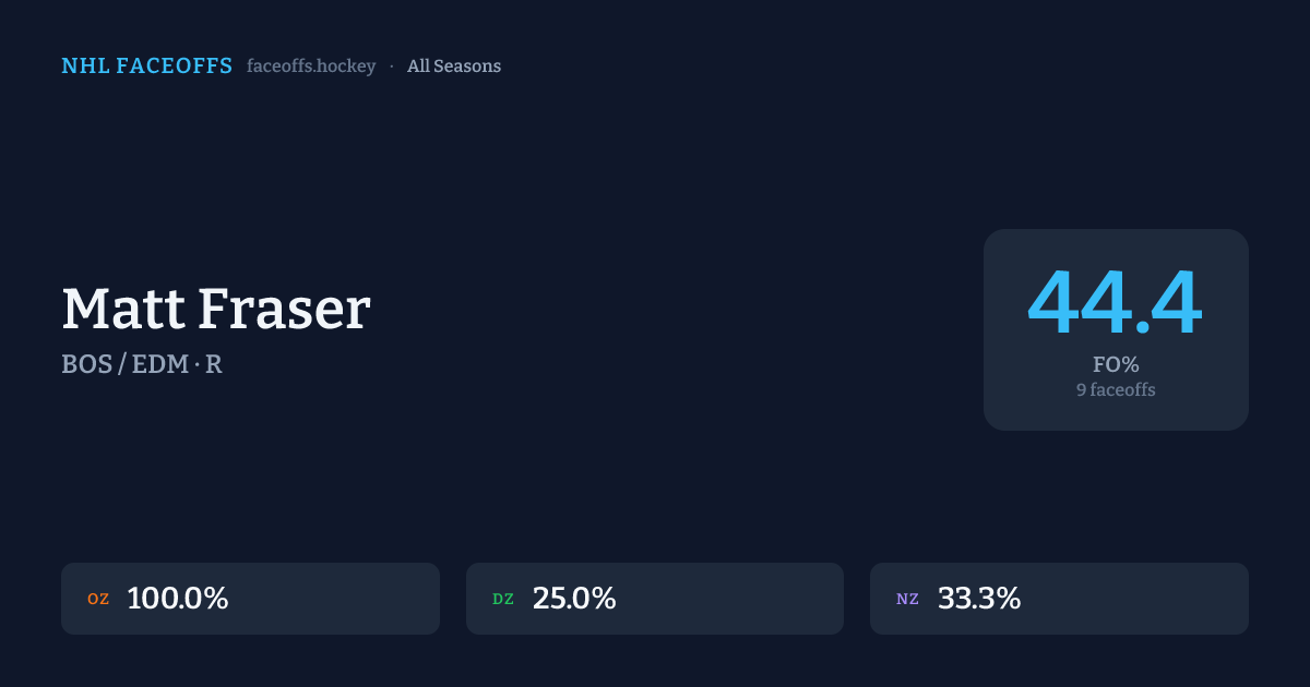Matt Fraser has a career faceoff win percentage of 44.4% across 9 faceoffs. Best zone: Offensive (100.0%).