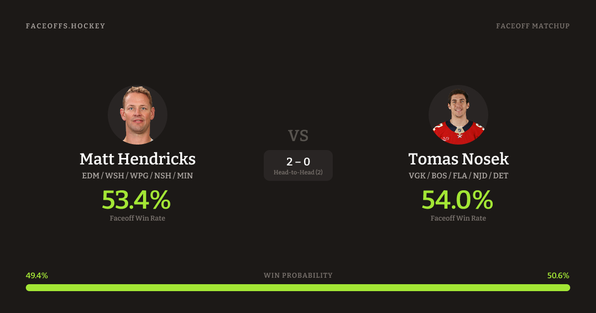 These two are closely matched in overall FO% (53.4% vs 54.0%). Hendricks wins 55.2% vs left-shot opponents — Nosek shoots left.
