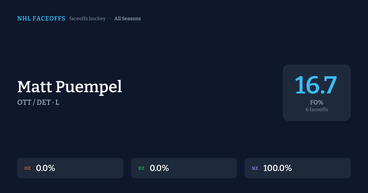 Matt Puempel has a career faceoff win percentage of 16.7% across 6 faceoffs. Best zone: Neutral (100.0%).