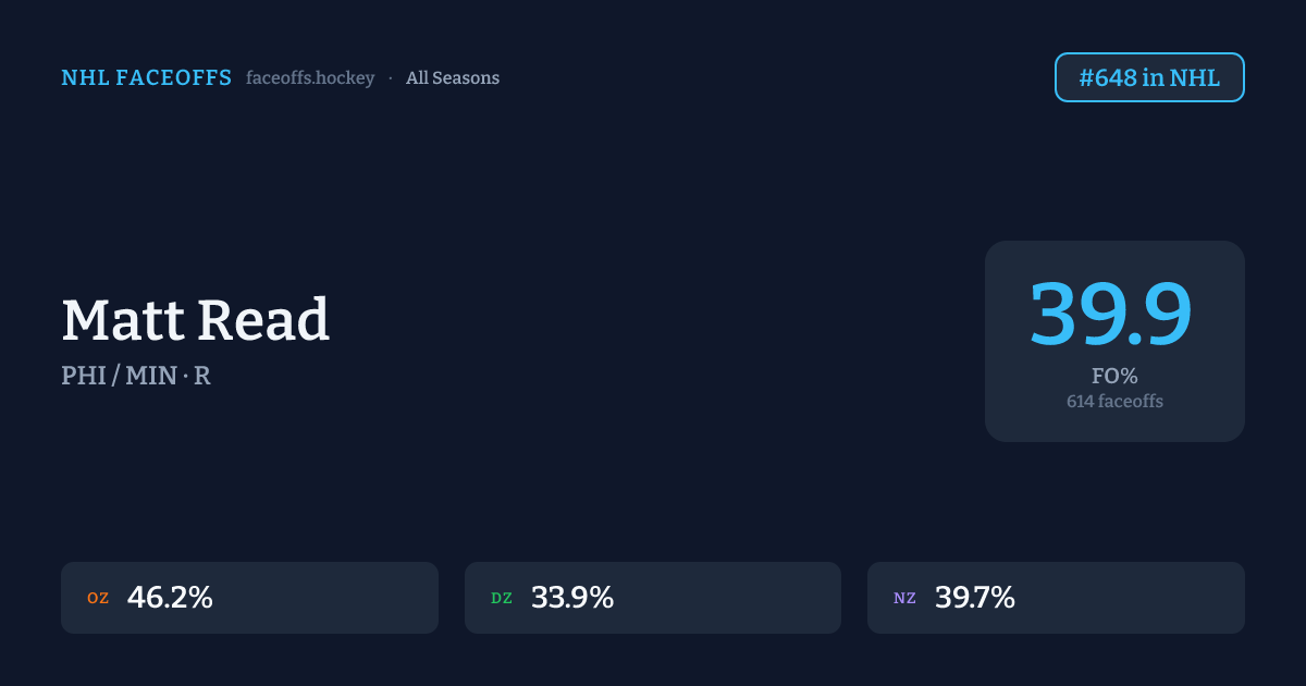 Matt Read has a career faceoff win percentage of 39.9% across 614 faceoffs. Best zone: Offensive (46.2%). Ranked #648 in the league.