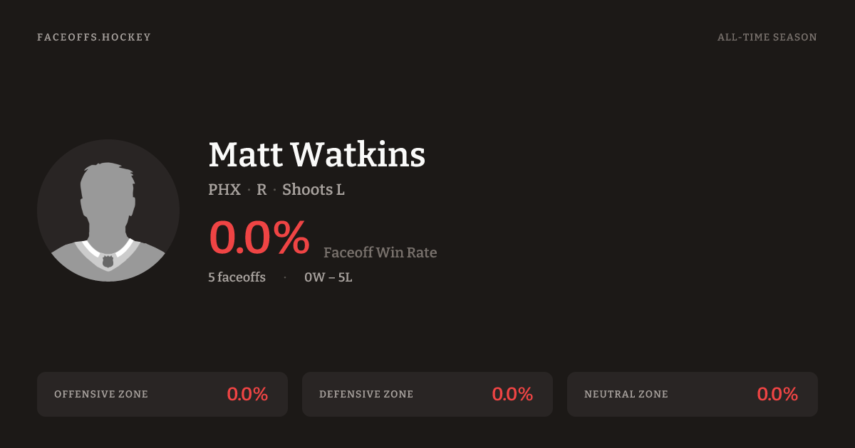 Matt Watkins has a career faceoff win percentage of 0.0% across 5 faceoffs. Best zone: Neutral (0.0%).