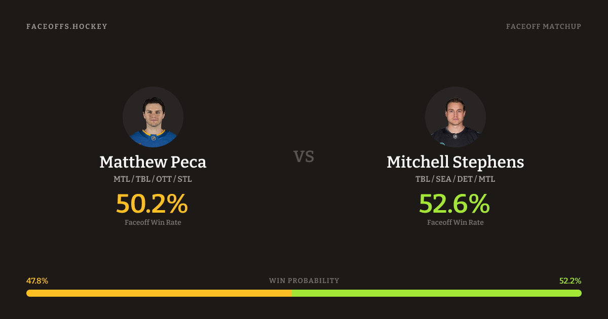 Mitchell Stephens holds a +2.4% FO% edge overall. Peca wins 57.0% vs right-shot opponents — Stephens shoots right.