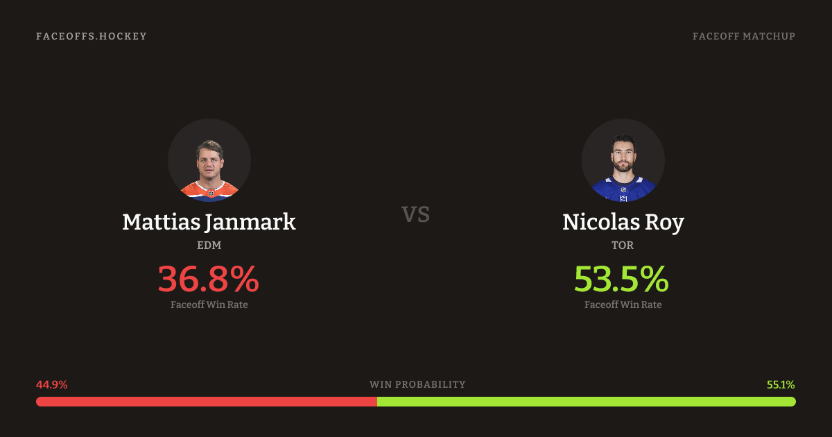 Nicolas Roy holds a +7.1% FO% edge overall. Janmark wins 41.3% vs right-shot opponents — Roy shoots right.