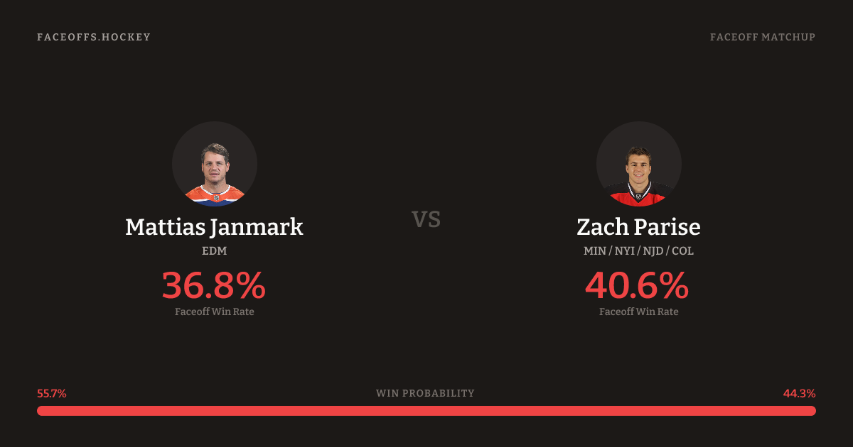 Zach Parise holds a +1.4% FO% edge overall. Janmark wins 38.9% vs left-shot opponents — Parise shoots left.