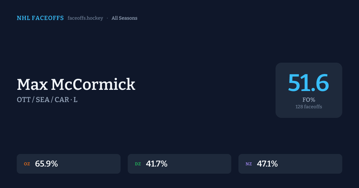 Max McCormick has a career faceoff win percentage of 51.6% across 128 faceoffs. Best zone: Offensive (65.9%).