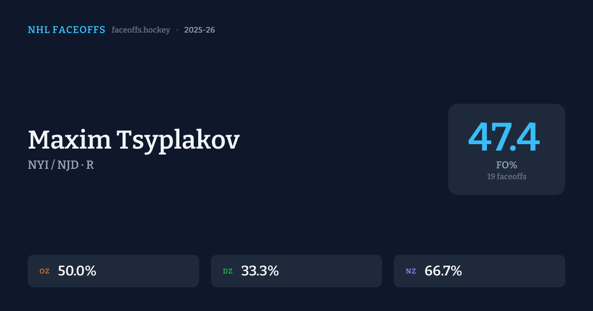 Maxim Tsyplakov has a 2025-26 faceoff win percentage of 47.4% across 19 faceoffs in the 2025-26 season. Best zone: Neutral (66.7%).