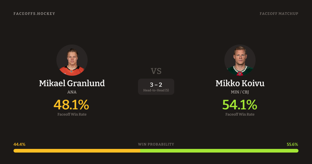 Mikko Koivu holds a +4.4% FO% edge overall. Look for Granlund on offensive-zone draws (100% H2H, 3 meetings).