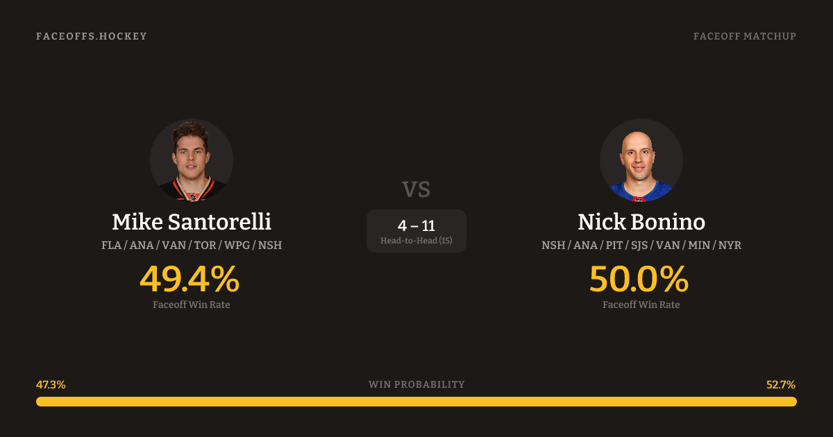 Mike Santorelli holds a +2.5% FO% edge overall. Look for Bonino on neutral-zone draws (86% H2H, 7 meetings).