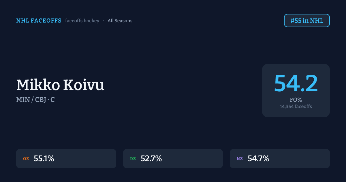Mikko Koivu has a career faceoff win percentage of 54.2% across 14,354 faceoffs. Best zone: Offensive (55.1%). Ranked #55 in the league.