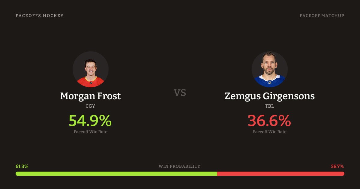 Zemgus Girgensons holds a +1.4% FO% edge overall. Look for Frost on neutral-zone draws (60% H2H, 5 meetings).