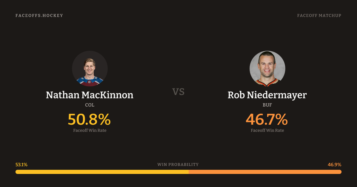 These two are closely matched in overall FO% (46.7% vs 46.7%). MacKinnon wins 46.9% vs left-shot opponents — Niedermayer shoots left.