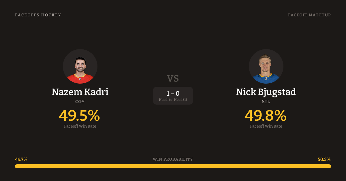 These two are closely matched in overall FO% (47.5% vs 47.8%). Look for Kadri on offensive-zone draws (60% H2H, 5 meetings). Kadri wins 53.7% vs right-shot opponents — Bjugstad shoots right.
