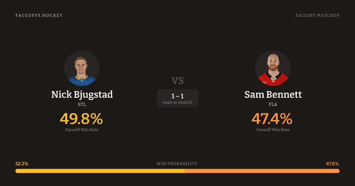 These two are closely matched in overall FO% (47.8% vs 47.0%). Look for Bennett on neutral-zone draws (78% H2H, 9 meetings).