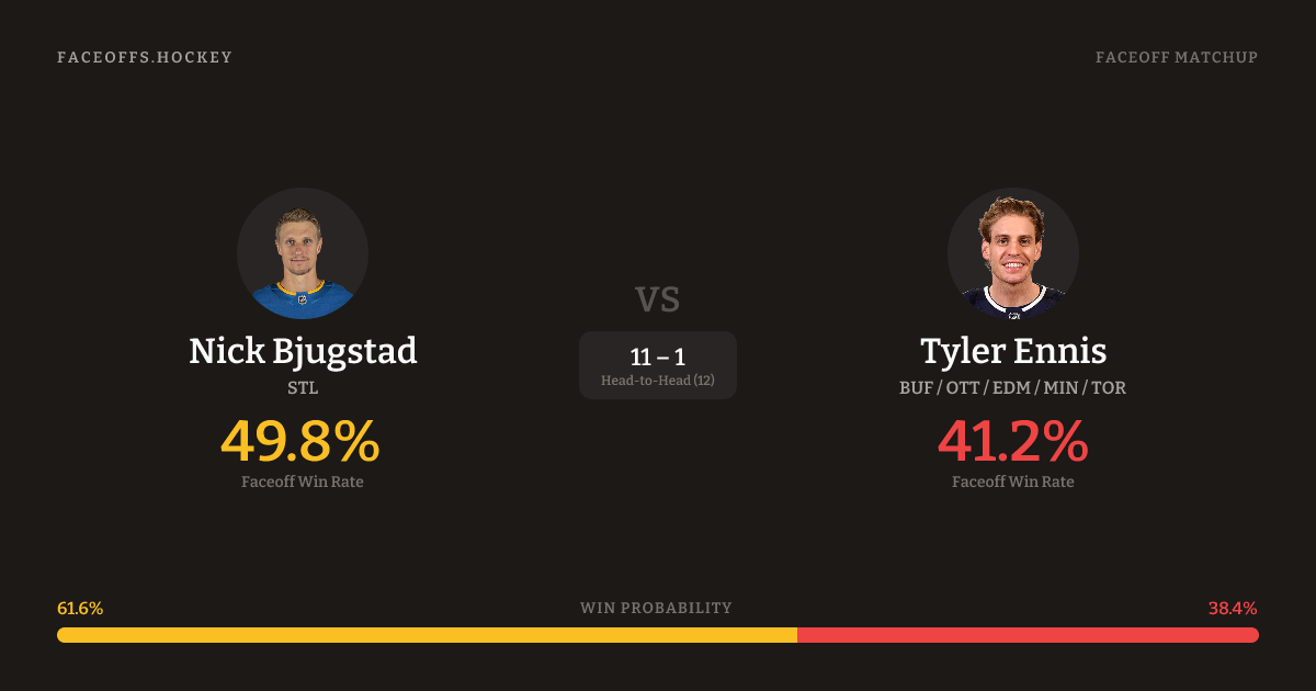 Nick Bjugstad holds a +10.2% FO% edge overall. Look for Bjugstad on neutral-zone draws (100% H2H, 4 meetings).
