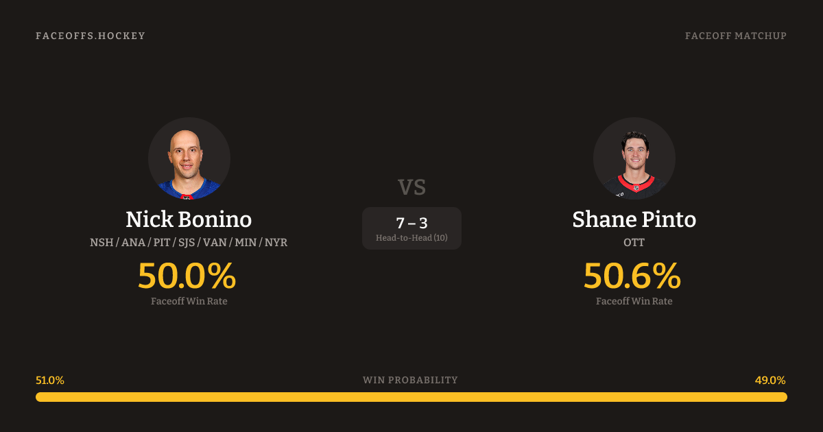 Shane Pinto holds a +3.9% FO% edge overall. Look for Bonino on neutral-zone draws (60% H2H, 5 meetings).